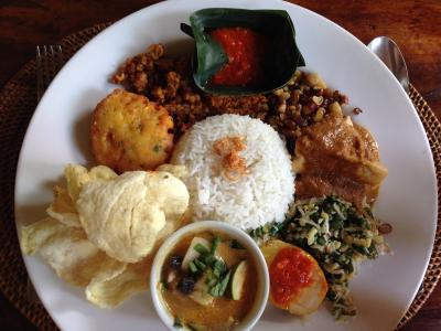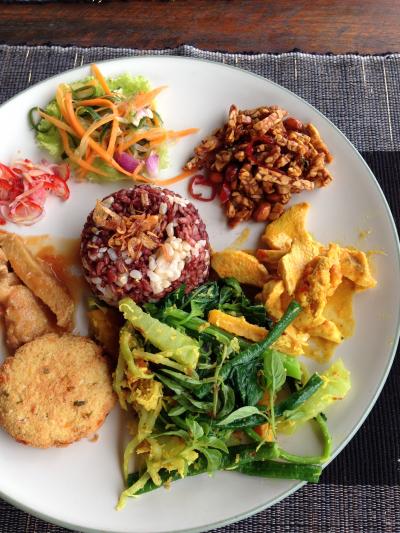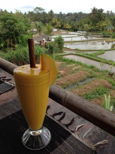 田んぼを見ながらのんびり出来るカフェです。天気のいい日は気持ちのいいテラス席がおすすめ。ナシチャンプル(ベジタブル)と木のストローで飲むマンゴージュースをいただきました。町中の喧騒から逃れられてとても静かです。