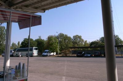 街の中心からは4番か5番のトラムで。スーパー345が見えたらすぐ降ります。バスターミナルはそのスーパーの裏手にあります。スーパーの前にはスイカを積み上げた果物屋さんがあり、ターミナルにはカフェのようなお店と売店、有料のトイレもありました。