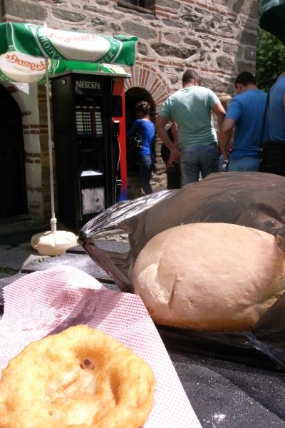 僧院を抜けたところに小さな石造りのお店があり並んでいました。揚げパン1つ0.5Lv(約35円)は粉砂糖をふりかけて。味は想像通りです。おすすめは大きなパン。1つ1.5Lv(約100円)外はカリっと中はもちもち。ほんのり塩味で美味しかったです。