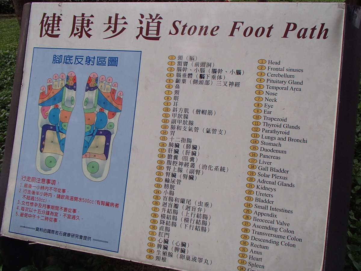 靴を脱いで素足で歩くとアイタタタ!となりますがしだいになれてきてふつうに歩けるようになるから不思議です。どこの場所が何の臓器に効くのか解説された看板が立っていました。- 旅行時期
