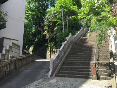 近くの愛宕神社の出世階段は有名ですが、それと同じくらい急で長い石段です。