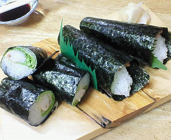 看板メニュー「レタス巻」は、シャキシャキのレタスとプリプリの大エビ、まろやかな自家製マヨネーズの海苔巻きです。
