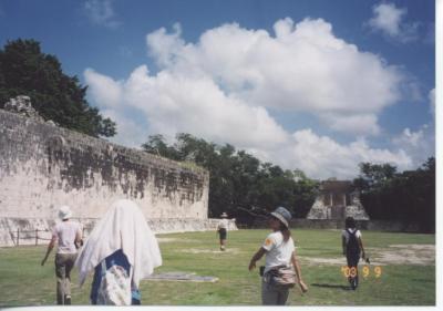 ピラミッドには相当急な階段をロープを伝って昇り降りしなくてはならないですし、頭からすっぽり被れて両手が空いて、汗も拭けるので便利です。