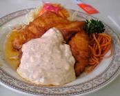 女性の手くらいある(手のひらではなく、手)チキン南蛮にこれでもかとかけられたタルタルソース。山高く盛られたキャベツの千切り。ここまででも大量なのにチキンの下にナポリタンスパゲティが敷き詰められています。