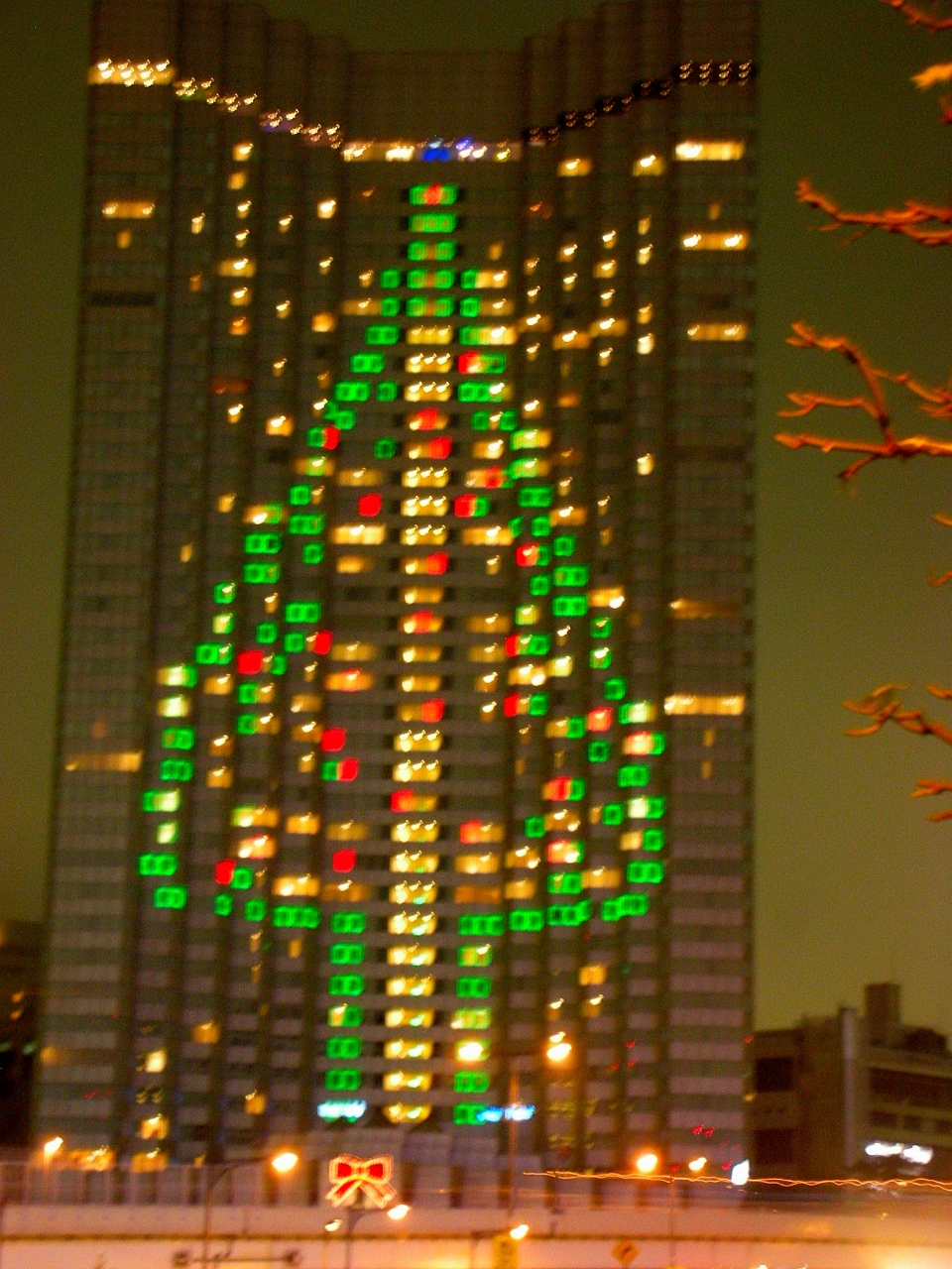 新館タワー全部を使ったもので、下にはちっちゃいけどリボンも点灯しています。
