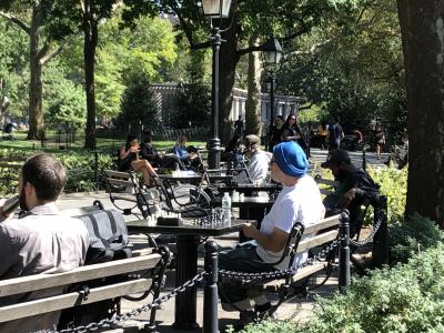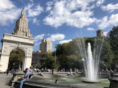ニューヨークのグリニッジ・ヴィレッジのど真ん中にある公園です。観光客にとってはヴィレッジ散策の目印兼休憩所であり、地元の人や、すぐ近くにキャンパスがあるNYU(ニューヨーク大学)の学生などがたむろする場所でもあります。そして、多くの映画のロケ地でもあります。公園自体に何かアトラクションがあるとか、すごい施設があるというわけではなく、凱旋門のような門と、噴水のある池と、広場とベンチとトイレとチェスをするコーナー、という程度ですが、ニューヨーカーの憩いの場で、大道芸人やミュージシャンが芸を披露していることもあります。そして、映画ファンにとっては、多くの映画でロケ地になっているので、現地に立つと感慨深いものがあります。「恋人たちの予感」でメグ・ライアンとビリー・クリスタルがここの凱旋門みたいな門の前で握手して別れるシーン、すごく若いロバート・レッドフォードとジェーン・フォンダの「裸足で散歩で」レッドフォードが酔っ払って歩くシーン、「ボビー・フィッシャーを探して」でボビーがチェスをするシーン、他にも「ゴーストバスターズ」や「セルピコ」や「アヴェンジャーズ/インフィニティ・ウォー」などにも出てきます。すぐ近くにNYUがあり、コープ(売店)で大学グッズを買えます。アメリカで最初にカプチーノを出したという老舗のカフェ・レッジオも目の前です(ここもロケ地で有名)。歩いて買い物して道に迷ったり疲れたら公園で一休みして…と、ヴィレッジを満喫する拠点です。