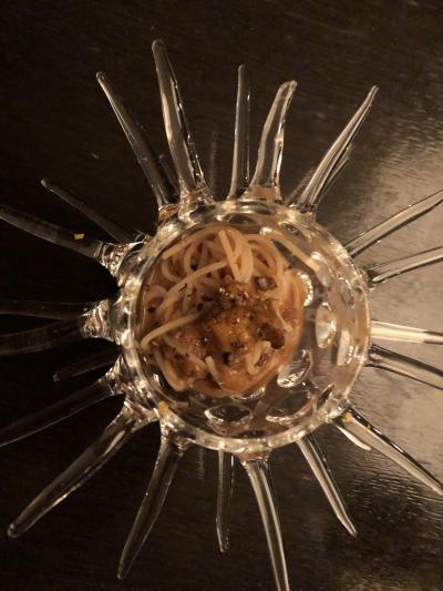 家族の誕生祝いで、ミシュラン一つ星!みたいにはしゃいで行ってみると、暗くてムーディーな店内のシャンデリアやガラスの食器やインテリアなどがバブル期っぽくて、子連れで食事する雰囲気ではない大人な空間で、お料理の味よりも演出の方が印象に残るようなコース料理をいただきました(美味しかったのですが、演出が都度都度凝っているので、そちらに気をとられてしまう)。たとえばウニの冷製パスタだと、ウニの形の(ギザギザにとがった)ガラスの食器で出てきたり、鳥の巣の中に鳥形のサブレと卵の形の器に入った卵料理の上にトリュフ乗ってたり、こういうお料理の供し方はある種最新のトレンドみたいですが、そこは好みなので、オーソドックスが好きな私は、演出に目がくらんでお料理の味が記憶に残りませんでした(美味しかった、としか)。でも、こういう最先端の雰囲気も含めてのミシュランかもしれません。とにかくお洒落で、最先端なのにどこか懐かしい(バブルだから)ゴージャスなイタリアンでした。
