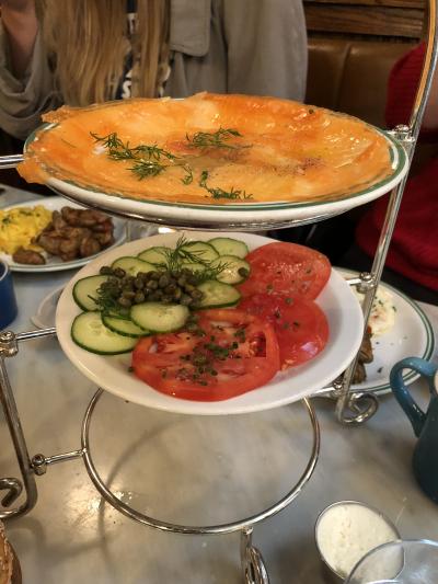ニューヨーク在住歴のあるアメリカ人の友人が、「明日は美味しいブランチを食べよう!」と、予約してくれたソーホーのお店で、ベーグルが美味しいことで有名とのことでしたが、「えー、わざわざベーグル食べに、朝からソーホーへ!?」と、腰重く行ってみたら、ソーホーらしい、おしゃれな外観のお店は、朝から行列になっていました。予約していても少し待たされましたが、いろいろな種類のベーグルや、とろりと美味しそうなサーモンなどがずらりと並んだ店内を見ながら待つのは気にならず、というか、待っている間に何を食べるか決められず、オーソドックスに「ベーグルとサーモン」をオーダーしました。ベーグル以外にも、サンドイッチやバーガーなども魅惑のメニューが並んでいましたが、やはり日曜のブランチということで、皆、ベーグルを食べていました。で、そのベーグルが、美味しい!!友人3人と総勢4人でそれぞれ別々のベーグルを頼んだところ、どれも美味しそうで、また来なきゃ!と、早くもリピーターを決意。そしてサーモンが…とろとろで新鮮で、けっこうな量でしたが、ぺろりと完食。トマトとケイパーもどっさり付いてきました(ケイパーまで美味しかった)。友人は、ベーグルとソーセージ(すごく密度の濃そうな)を頼んだり、ベーグルと普通の朝食メニュー(スクランブルエッグとか)を頼んでいました。ニューヨークでベーグルが美味しいお店はたくさんありますが、ちょっと贅沢な気分でゆったりとブランチを楽しみたいときに、お勧めです。持ち帰りだけもOKで、そちらもニューヨーカーに大人気でした。