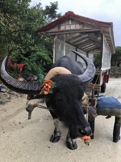 竹富島の真ん中が街というか集落になっていて、その北西の辺りに乗り場があり、大きな黒い水牛の「ピーすけくん」が引く車で、あの、竹富島の人たちが伝統を一生懸命守っている街並みを、どっこどっこと巡ってきました。その前日に雨の中をとぼとぼ歩いた同じ街並みが、水牛車から見ると、全然違って見えます。目線の高さはもちろんですが、水牛の歩くリズムが、竹富島の古い、伝統を一生懸命守っている沖縄古来の街並みの風景に、すごくしっくり来ます。おじいのガイドさんが、ずっと、いろいろなエピソードを話してくれて、途中でおもむろに三線を取り出して、「安里屋ユンタ」という古い沖縄の歌を歌ってくれます。この歌と、水牛のどっこどっこと歩くリズムと、竹富島の街並みが織りなす空気…至福のときで、あっという間に終わってしまった気がして、ああ、もっと乗っていたいなー、と思いました。(しかしピーすけくんは重労働なので、終わると体温がすごく上がるとのことで、気の毒でした。)旅では、その土地ならではの体験や感覚や空気を味わいたい!という人には、お勧めです。