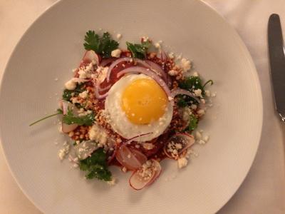 セントラルパーク・イースト、マディソン・アベニュー近くの高級な場所柄を正しく反映したような、店構え・内装・客層・価格…全て高級な、明るく楽しい雰囲気のフレンチで、有名シェフのダニエル・ブール―のお店です(その名を知らずに入りましたが)。平日の遅めのランチを取りましたが、お店は結構満席に近く、観光客らしきは自分だけで、アジア人らしきも自分だけで、おまけに現地で足を骨折して大きなギブスをした足でよちよち入店して、他の客から白い目で見られるかな…店員から冷たく扱われるかな…と半分覚悟していたものの、楽しそうに飲食している客は誰もこちらをじろじろ見ることなく、高級店なのに良い意味でカジュアルな接客の店員の女性が大変感じが良く、初めて入る店でしたが、くつろいで食事できました。自分以外にも、一人で食べている客もいました。ランチはプリフィックスで、前菜とメインをいくつかの候補から選び、デザートはワゴンいっぱいのケーキから選ぶという形で、それ以外に暑かったので搾りたてオレンジジュースと冷えた白ワインをいただきましたが、飲み物も食べ物も全て美味しかったです。(唯一、メインが若干失敗して、好きではない味付けでしたが、店員とのコミュニケーションが足りなかった自分のせいなので。)腹十二分目くらいお腹いっぱいなのに、最後にサービス?で焼き立てミニマフィンが山ほど出てきて、食べられないので「持ち帰りたい」というと、さくさくと箱に入れてくれて、ギブスの私に店員さんが腕を貸してくれて送りだしてくれるなど、高級店なのに本当に温かいサービスで、旅先の人の親切が身に染みる良いお店でした。