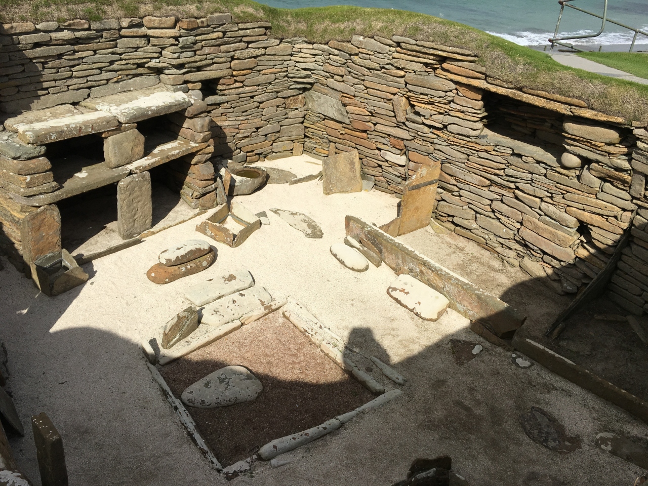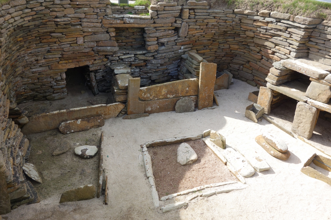 スコットランドは英国の北にあり、本土からさらに北にあるオークニー諸島は、英国領でありながらバイキング文化の爪痕も残る文化ミックス地帯、そして、新石器時代の遺跡の宝庫(まとめて世界遺産になっている)という、どきどき・わくわくの島です。4500年前(5000年前説もある)の住居群遺跡「スカラ・ブラエ」はオークニーの最も有名な遺跡のひとつです。オークニー諸島の一番大きな島・メインランド島の西の海岸にあるこの遺跡は、ずっと地中に埋もれていて、存在が知られないまま、19世紀に嵐が来て、遺跡の一部が地上に現れたことから発見されたため、何千年も前の住居が、信じられないほど鮮やかに残っている保存状態の良さと、樹木も生えない北の果ての島に忽然と現れる古代遺跡の迫力とで、現地に立つと、感動しかありません。こんな最果ての島に、エジプトのギザのピラミッドより古い古代遺跡が存在するなんて!遺跡を発見した人の屋敷が、少し歩いた所にあり、同じチケットで見学できます。