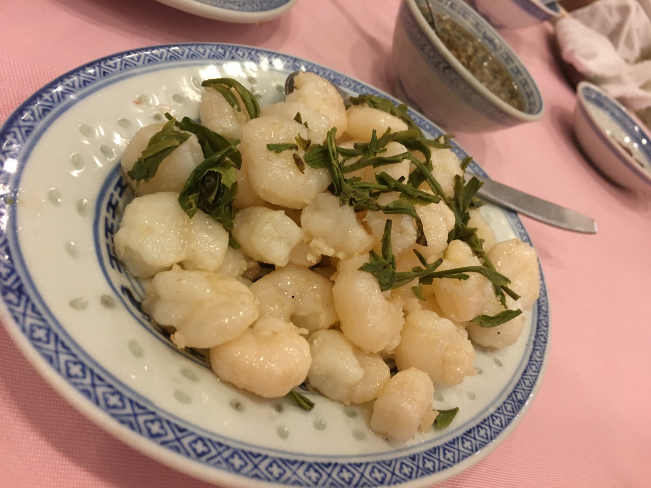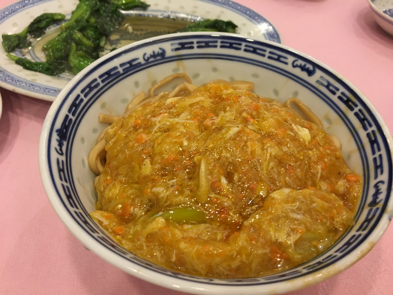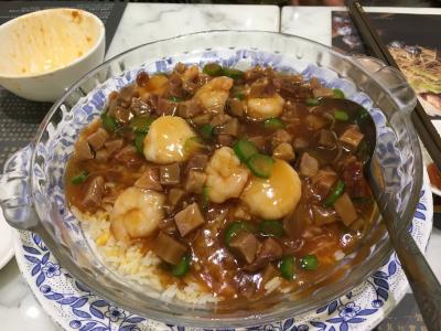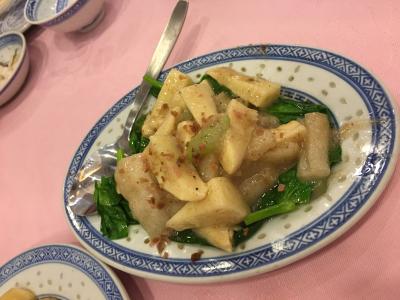 昔からある香港の名店で、とにかく高くて旨い、香港のお金持ちの食い道楽たちが通う店らしい…と、前々から噂には聞いていて、2018年に家族で香港に行った際に、念願かなって連れていってもらいました。私の愛読する香港在住日本人によるグルメ本では、家族4人でここのお勧め料理8品を食べると合計が10万円を軽く超えると書いてありましたが、我々はランチだったので、ここの有名なメニューから4品をいただきました(払ってもらったので、金額はよくわかりません)。有名なメニューその①=上海ガニの卵と蟹肉と蟹みそを、塩と紹興酒で餡にして、フェットチーネみたいな平たい麺にかけたもの、その②=淡水えびを龍井茶の茶葉で炒めたもの。あと、青菜の炒め物とかも食べましたが、①と②がずっと食べたかったので、満足でした。①だけで、一人5000円くらいするそうです(!)写真に撮ると、ただの親子丼みたいな写りで、感動を伝えにくいのが残念です。