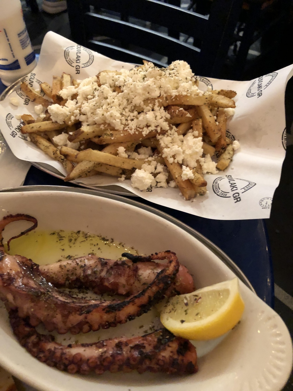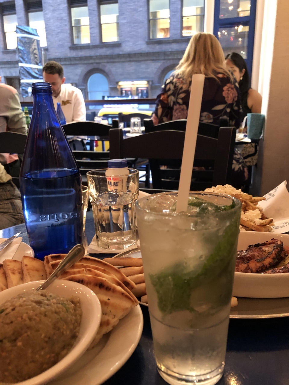 NYに着いた後に転んで足を骨折したので、泊まっていたホテル(レストランがない)から折れた足で徒歩圏内のレストランを探して、ホテルからワンブロック南に、高級地帯にぽつんと奇跡のように雰囲気もお値段もカジュアルなギリシャ料理のお店を発見。満席に近く、私が食べている間も次々にお客さんが入ってきて、人気のようでした。食べたものは、タコのグリル(絶品!!!)、メリジャノサラタというペースト状になった茄子をピタパンに乗せて食べるもの(お皿まで舐めたいほど絶品)、フェタチーズのかかったフライドポテト、そして暑かったので、モヒートと白ワイン、食後に「サービス」と言って、マスティハというアルコール度数の高い、甘いお酒を飲みました。この周辺は、お値段もお高く、ドレスコードがあるようなお店が多い地帯ですが、海辺のリゾート地の、水着にシャツ羽織ってふらりと入れるレストランのようなカジュアルな店構えと内装、店員もカジュアル(親切)で、お値段も普通というか安めで、次回NYに行ったら、再訪しよう!と思える貴重なレストランでした。お店の通りをはさんで向かい側のカーネギー・ホールを見ながら食事するのも乙な感じでした。
