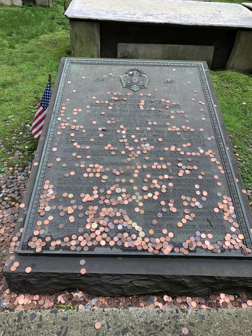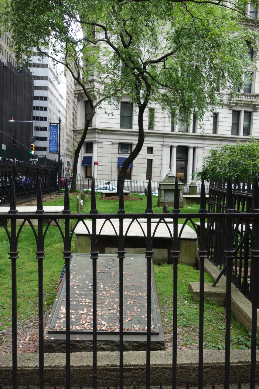 ブロードウェイ・ミュージカルの近年最大のヒット作「ハミルトン」に感動して、主人公で、アメリカ建国当時の実在の人物(10ドル札の人)アレクサンダー・ハミルトンの聖地巡礼で、お墓を見に行きました。マンハッタンの最南端に近い方の、ウォール街にあります。ニューヨーク証券取引所(NYSE)のすぐ近所で、ワールド・トレード・センターからも徒歩すぐです。教会自体はわりとこじんまりしていて、建物内部にそれほど見るものはなかったです。お祈りしている人がいるので、中では喋ったりはできません。入場は無料ですが、建物内に入る際、荷物検査(バッグを開けておじさんに見せるだけ)がありました。ハミルトンのお墓は、教会の墓地の方ではなく、教会をはさんで墓地と反対側のお庭に、銅板みたいな記念碑みたいな小さな金属製の碑が地べたにあり、そこにたくさんの小銭が投げられていて、それがハミルトンのお墓でした。周りにもっと立派なお墓がたくさんあるのに、アメリカ建国時のヒーローが、こんな小さなお墓なのかと切ない気持ちになりました。「これがハミルトンのお墓」みたいな何の説明書きもないので、わからなくて、荷物検査のおじさんに場所を教えてもらいました。