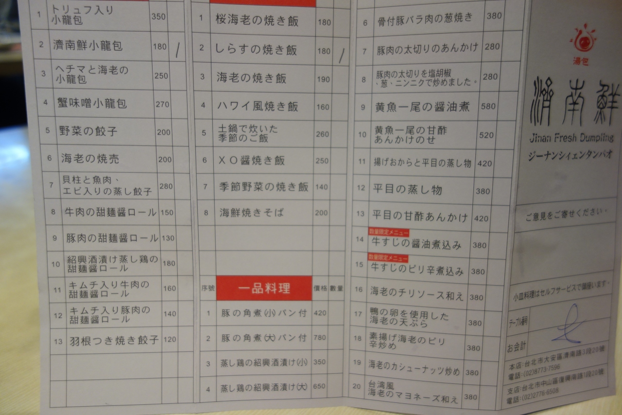 台北で小籠包が美味しいといわれるお店がたくさんある中で、どこに行こうか…と悩んで、泊まっていたホテルからわりと近かったこちらのお店に行ってみました。地下鉄(MRT)の「忠孝新生」駅から歩いてすぐの便利な場所にあり、お店は小ぎれいで少しおしゃれな感じだからか、行った時たまたまか、日本人の駐在員っぽい家族連れが複数店内で飲食していて、奥様方が店中に響き渡る大声で「ヘチマの小籠包、ないのお~?!」などと叫ばれていたので、ヘチマの小籠包が人気の店なのか…と知りました(その日は既に品切れになっていて、プレーンの小籠包を食べました)。小籠包は、ぽたぽたにスープが満ちていて、とても美味しく、カリカリのシラスがどさっと乗ったチャーハンも絶品で、蛤のおすましみたいなスープも、とても滋味深い味で、どれも本当に美味しかったです。他にも食べてみたいメニューが目白押しだったので、次回は複数で(なるべく大人数で)行ってみたいと思いました。日本語のメニューが出てきて、数を書き込むようになっていました。場所も便利だし、美味しいし、お値段もリーズナブル(プレーン小籠包とシラスのチャーハンが650円くらい、肉や魚のメニューは1000円以上していましたが、クオリティからすると十分リーズナブル)で、お店も綺麗なので、日本人観光客が安心して行けるお店かと思います。