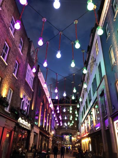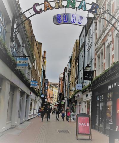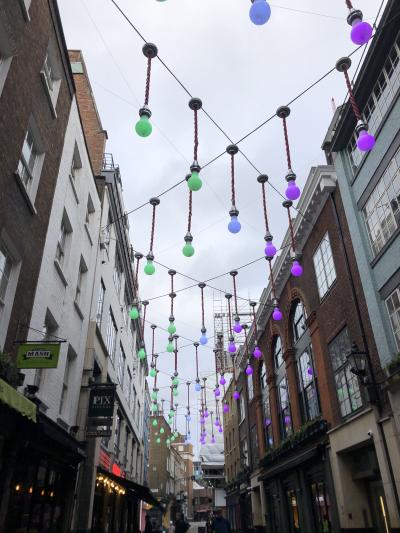モッズ・ファッション発祥の地、と言われても、おばさんの私でさえピンと来ないですが、ビートルズが出たての頃のファッションの中心地だったカーナビー・ストリートは、今でもお洒落で個性的で、いい感じの店がキュっと集まる小さな素敵な通りです。ロンドンの買い物の超中心地のオックスフォード・サーカスから歩いてすぐの、リージェント・ストリートから1筋入ったところで、チューダー様式の目立つ百貨店リバティの真裏で、ピカデリー・サーカスからも歩いてすぐの、場所としてはこれ以上ないくらい至便な場所ですが、うっかり見逃してしまうかもしれない一見裏通りっぽい通りです。どの入り口から入っても「カーナビー・ストリート」とかわいいネオンサインがあって、夜になると小さな電球かぴかぴかと光って素敵だし、時期によってはメッセージネオンが出たりするみたいです(映画「ボヘミアン・ラプソディー」がヒットしていた時期には、ボヘミアン・ラプソディーの歌詞のネオンがきらめいていたらしい!)。ディーゼルとかドクターマーチン、ビルケン、ラグ&ボーン、MUJIなど、有名ブランドでもちょっとエッジーだったりお洒落なブランドが、いい感じの店構えで並んでいて、単なるブランド通りではなく、主義主張のあるお洒落ストリートという空気です。飲食店もあります。リバティ百貨店に行ったら、裏手のこの通りに忘れず足を延ばしてください。