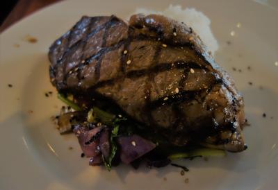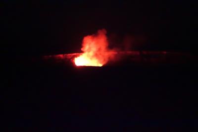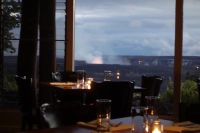 ハワイ島の現地ツアーでヒロやレインボー滝や火山公園の溶岩のトンネルなどを巡ったあと、夜、暗くなってから、こちらのボルケーノ・ハウスというホテルのメインダイニングで、目の前に活火山の炎が上がっているのを見ながら、コースのディナーを楽しみました。まずホテルは、19世紀に小さな宿からスタートした老舗で、老舗ならではの落ち着いた風格がありながらも、どこか古いハリウッド映画に出てくる南洋のホテルみたいなエキゾチック感もあり、わくわくします(泊まりたかった!)。メインダイニングの「The Rim」でコース料理をいただきましたが、ツアーのコース料理だから手抜きなのではと、全然期待していなかったのに、ステーキも魚も(メインがどちらか選べるので、家族で両方頼んで色々シェアした)、とても美味しく、さすが老舗ホテルだと感心しました。そしてレストランの全面ガラス張りのガラスの向こうはキラウェア火山の火口(ハレマウマウ火口)で、昼間は(私が訪れた時期には)煙しか見えなかったのですが、夜になると炎が赤く燃えているのが見えて、しかも日本の火山みたいな火口が深いところにある形ではなく、平らな火口に真ん中で火が燃えているので、目の前が活火山!という臨場感がすごかったです。料理は美味しいわ、火山の写真は撮りたいわ、ツアーなので時間が限られていて、ホテルの売店もとても素敵だったので駆け足で買い物もしなければならず、焦りました。今度ビッグ・アイランドに行くことがあれば、ボルケーノ・ハウスに泊まってゆっくりしたいです(でも、その後の大噴火で火口の形はすっかり変わったそうです。)