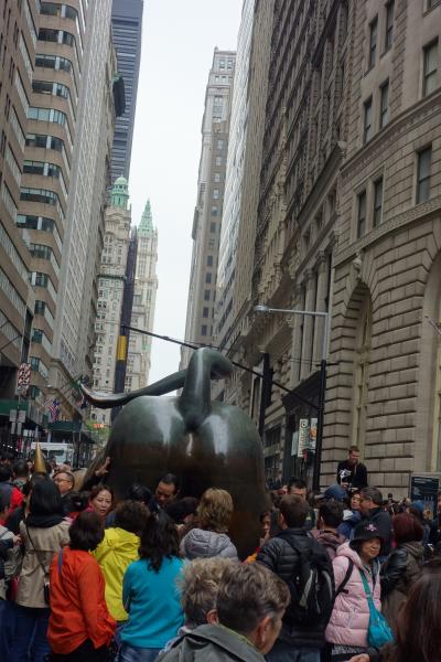 ニューヨーク・マンハッタンのダウンタウンを久々に歩いていたら、有名な「チャージング・ブル」と「恐れを知らぬ少女」像のところを通りかかったので、ついでに写真でも撮るか…と思ったら、ものすご~~~い人だかりで、牡牛側と少女側にそれぞれ山のように人がたかっていて、何となく順番に写真撮影しているので、何となく列に加わって待っていたら、大型観光バスで乗り付ける、赤・青・ピンクなど原色のジャンパーに70年代みたいなくるくるパーマの中国人ツアー客ご一行が並んでいる人たちをガン無視で割り込んで写真撮って去っていく…という地獄のような場面に遭いました。本来なら、突進しようとして前のめりになった巨大な牡牛と、その前に敢然と立ちはだかる少女…という配置なのですが、間に山のように人がいるので、人の群れの上に牡牛がチラ見えするだけのシュールな光景になっていて、牡牛と少女の2ショットは見られずでした。いつの間にこんな像が立ったのかなあ。前回ロウワー・マンハッタンを歩いたとき(すごく昔)にはなかった…そして、なぜそこまで人気なのかも、現地では理由がわからずでした。場所は地下鉄ウォール・ストリート駅から(2番線・3番線の駅からでも、4番線・5番線の駅からでも)ワンブロックほど、徒歩5分もかからない辺りで、トリニティ教会とかの近くで、ウォール街とブロード・ストリートの角っこです。