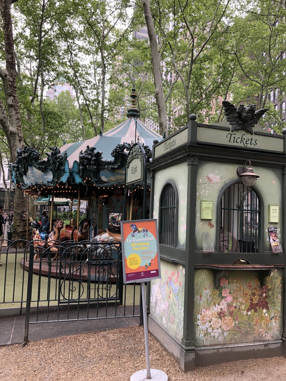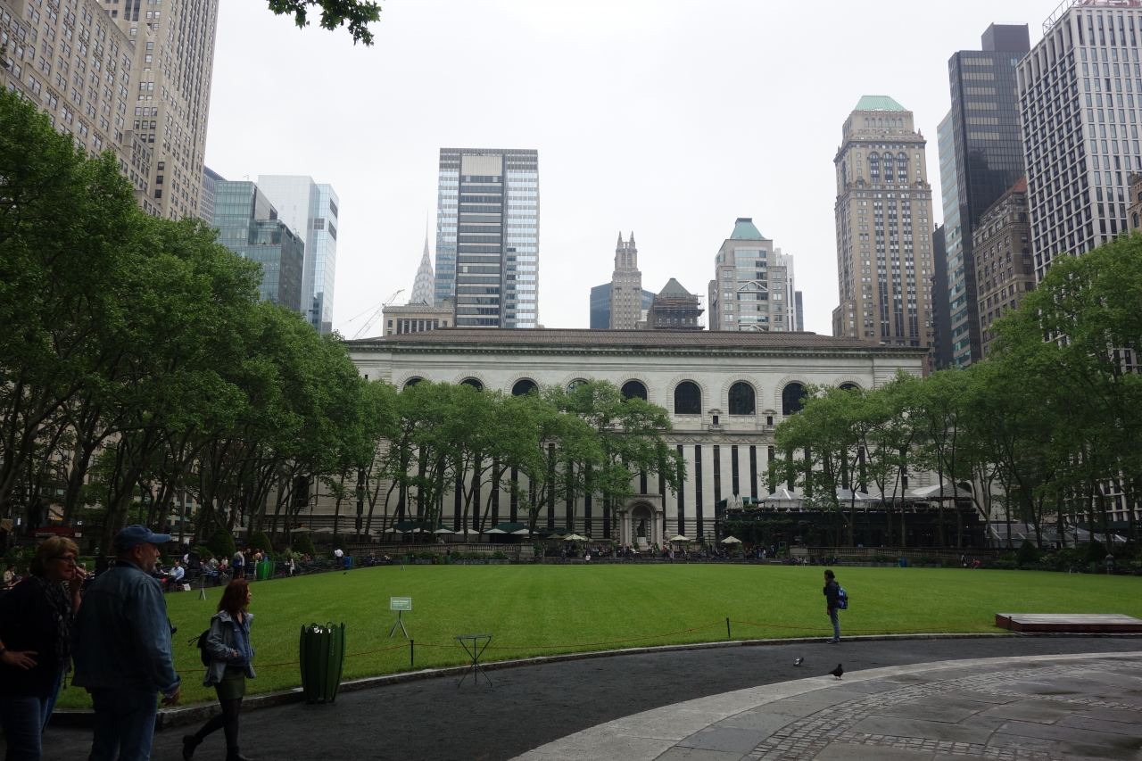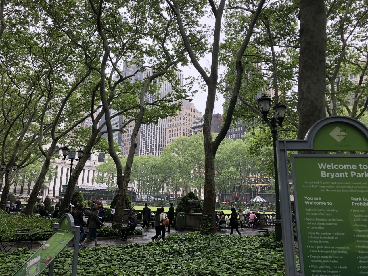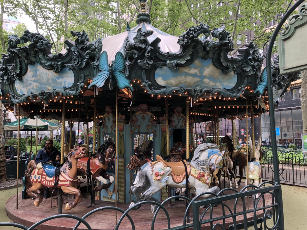 ニューヨークの公園というとセントラル・パークが一番に思い浮かびますが、NYにはたくさんの公園があり、どこもそれぞれ個性的な顔があって、それぞれ本当に素敵です。ブライアント・パークは、まず場所が最高に便利で、観光客にとっては「観光のついでに足を延ばしやすさ」ではトップクラスの、タイムズ・スクエアから1ブロック(歩いてすぐ)、「ゴーストバスターズ」のロケ地で有名なNY公立図書館と隣接していて、グランドセントラル・ステーションからも徒歩すぐ(ついでに目の前に紀伊国屋書店と大きなホールフーズ)というロケーションで、公園の真ん前に地下鉄の駅が2つ(5路線分)、5分歩けばさらに大きな地下鉄の駅が2つ(一つは中長距離列車の駅を兼ねる)という、ほぼ最高に便利です。広さはセントラル・パークのような歩いて一周無理!みたいな広大さではない、いい感じにコンパクトで、いい感じに広く、真ん中にどどーんと緑地があり、冬にはスケートリンクが出来たり、有名なニューヨーク・ファッション・ウィーク(SATCの女子たちが見に行った)の会場になったりします。公園内で飲食できる売店と椅子やテーブルがあり、かわいいアンティークな感じの回転木馬や、誰とでも対戦できる卓球台やチェスコーナーがあったり、旅行者もちょっと座って休憩しながら、ニューヨーカーの活動を見たりできて楽しくて、ついつい長居しそうになって、時間のない旅行者には困った魅力のある公園です。周りにたくさんの美味しいベンダーも出ているので、買ってきてここに座って食べるのもいいです。