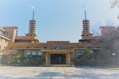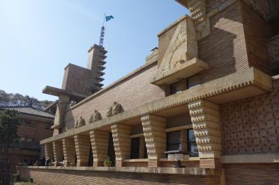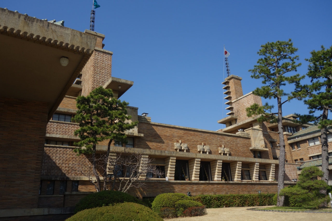 日本に残る数少ないフランク・ロイド・ライトの建築のうち、ヨドコウ迎賓館(ライト本人の作品)と、ここ旧甲子園ホテル(ライトの直弟子・遠藤新の作品)が兵庫県に、というか阪神間にあって、簡単に見られることは、類まれな幸福だと思います。旧甲子園ホテルは、昭和初期(1930年代)に武庫川沿いの高級リゾートホテルとして建てられ、皇族や海外の王族など一流の客層でにぎわったのもつかの間、第二次大戦中は軍の病院になり、ホテルとしての寿命は大変短く終わってしまい、戦後は米軍に接収され…という苦難の歴史を経た後、武庫川女子大学が譲渡を受けて修復し、今も自腹でしっかりと保守をされているおかげで、建築史上の超一級の価値を損なうことなく、今、我々一般人が無料で見学できるのは(予約制)、本当にありがたいことです(普段は武庫女の建築学科の校舎として現役で稼働中です!)。リゾートホテルだった戦前のたたずまいを、一度でいいから見てみたかった…!と、悶絶の思いにとらわれます。ライトの弟子のデザインと言っても、ライトそのものの精神が隅々のディテールまで行き渡って、見学時間帯だけではとても全貌を把握することができないほど、めまいがするほど華麗で美しく、見どころだらけの大傑作建築です。正面の門から見たシンメトリー、打ち出の小槌の装飾、床面のモザイクのタイル、「FLW」の隠し文字、帝国ホテルなどでも見ることができるライト・シグネチャーの装飾がそこかしこで繰り返されるオーガニック建築の、ただただその美しさと技巧に圧倒されます。建築好きな方、建築を学んでいる方、阪神間モダニズムに関心のある方、必見です。大学の職員の方?が完璧なガイドとして豊富な知識とエピソードを繰り出して説明してくれて、知的興奮倍増です。お茶付き見学や、花見などのイベント時の見学もあります(コロナ下では見学を中止しているようです)。