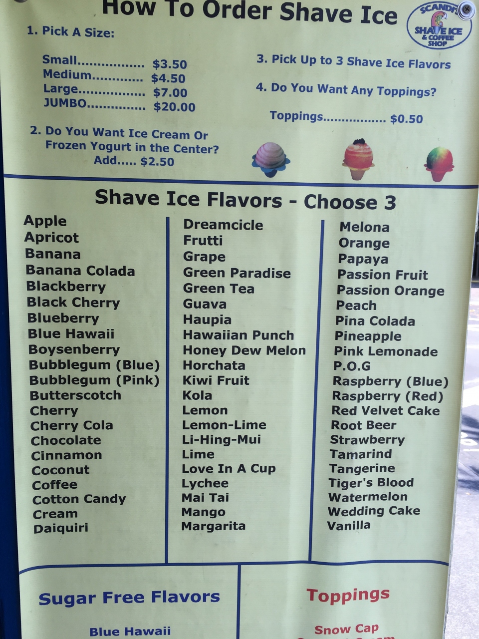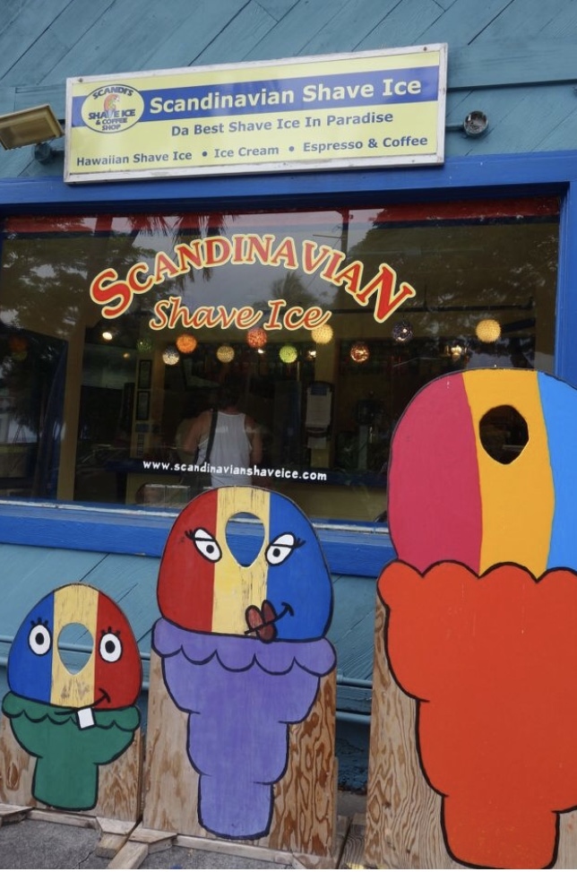 ハワイ島の西海岸のリゾートホテルが集中する地帯・ワイコロアに泊まると、車ですぐのカイルア・コナが付近では一番大きな街なので、幾度となく繰り出して買い物や食事や観光することになりますが、カイルアコナの街を歩くと何度も前を通る、とても目立つ店構えなのが、ここスカンジナビアン・シェイブ・アイスのお店です。小さな店ですが、店の前のカラフルなシェイブ・アイス型の「顔ハメ看板」が目立つので、すぐにわかります。オーダーは意外に難しく(と言っても、これ以上ないほどわかりやすい「オーダー方法」が貼ってあるので、難しいのはフレイバーの選び方)、①サイズを選んで、②アイスクリームかフローズンヨーグルトを入れるか、氷だけかを選んで、③3種類のフレイバーを選ぶ、④トッピングの有無を決める…という手順でオーダーするわけですが、③の3種類のフレイバーを選ぶところで悩んでしまいます。全部で60種類くらいある中から選ぶのがそもそも悩むし、選択を誤ると、レインボーカラーになりません(うちの当時中学生の男子は選択を誤って、緑のグラデアイスになりました)。適宜、お店の人が「それとそれにすると青青になるよ」などと教えてくれますが、並んでたりすると焦るし。とはいえ楽しい悩みですが!店の前のシェイブアイス型顔ハメ看板は、結構人通りが多い場所なので恥ずかしいですが、恥ずかしさに耐えて写真を撮っておくと、後で見ると、とっても楽しい良い思い出になります。