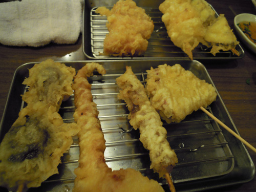 大き目の串揚げは、二度付け禁止のソースにたっぷりひたして。
