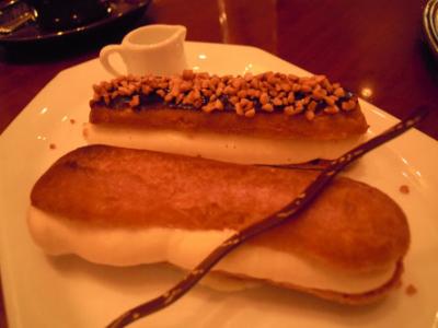 エクレアはツヤツヤで、食べる直前に自分でナッツをふるかけるタイプ。