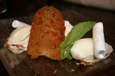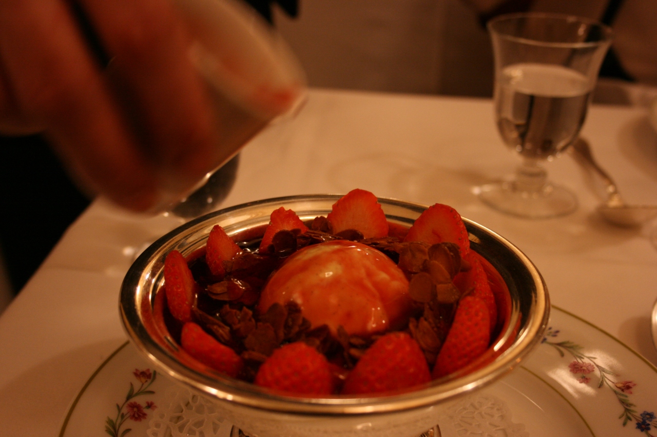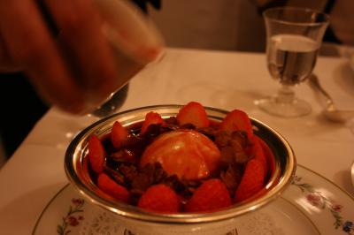 いちごの赤ワインソース、カルダモンのビスケット等。
