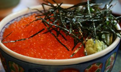 川魚のいくら丼は、サケのイクラと違って小粒