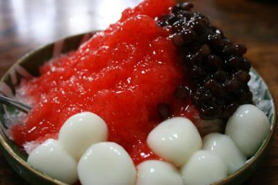 とろりとした真っ赤なイチゴシロップと見るからに美味しそうな小豆です。