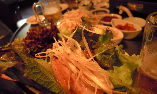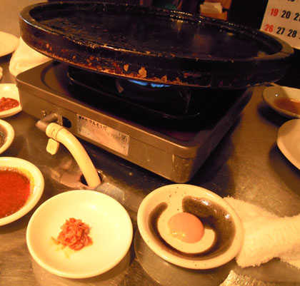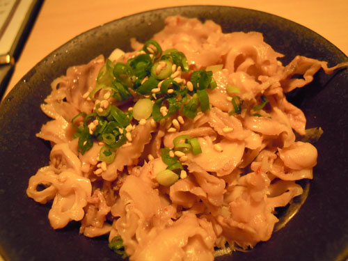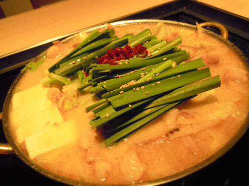 意外に普通だったから揚げと、みそ風味のしろもつ鍋を。