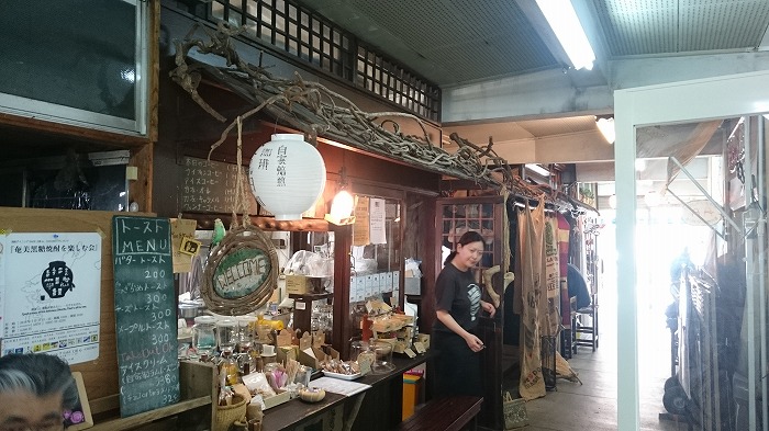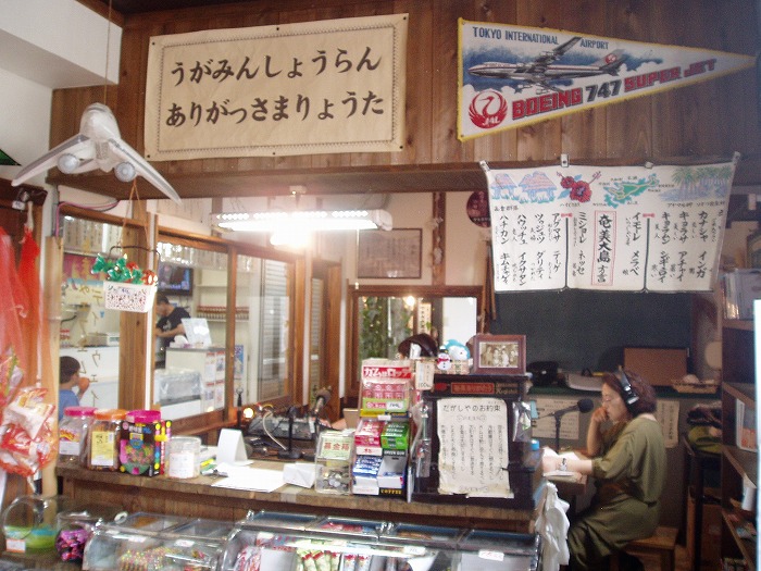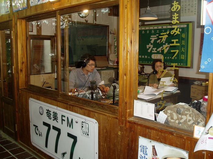 市場の一角にある奄美FM・ディ!ウェイヴの公開放送所。昼時の生放送が流れる中、ガラス越しにそのオンエア光景を眺めることができる。さらに、放送所のすぐ隣では駄菓子屋も兼業しており、ラジオ局スタッフがそのまま店員となって駄菓子を売っている。こんな地域密着見たことない!!