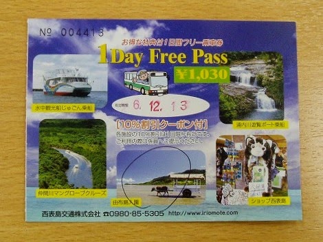 西表島交通が発行するバス1日乗車券1,030円は結構使える。例えば島東部の大原地区から西部の上原地区まで片道940円かかるが、この1日券なら1往復するだけで元が取れてしまう。しかもこの券を見せると、由布島植物園や遊覧船の値段が10%オフになるというから素晴らしい。ただオフシーズンにはバスが1日4往復しか走っていないのでよく計画を練っておく必要はある。