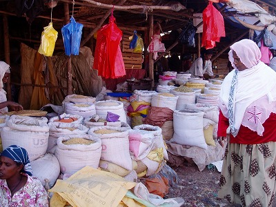 未舗装の敷地に、食品やら日用品やらが雑然と売られ活気がある。アジスアベバのメルカトにはスリや引ったくりが多いと聞くが、ここではそのような目には会わなかった。庶民の日常生活を垣間見ことができ、興味深い場所。
