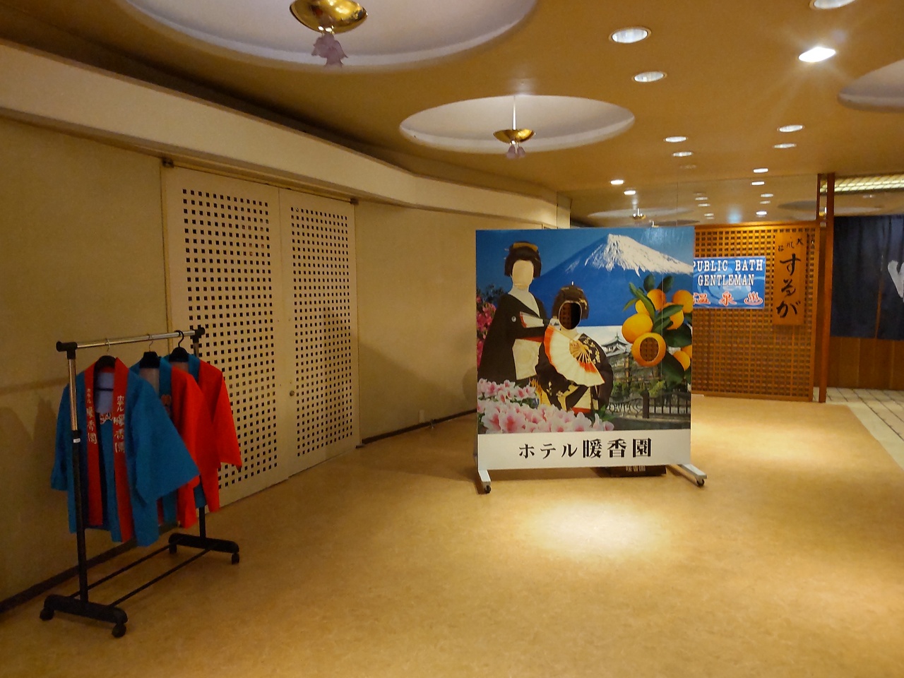 ロビー横の浴衣を選ぶところでは、1つ大き目を選ぶとよいと思います。子供用90cmサイズもありましたが、ウエスト、胸回りがパツパツで110㎝を着直しました。大人用は丈が短めです。