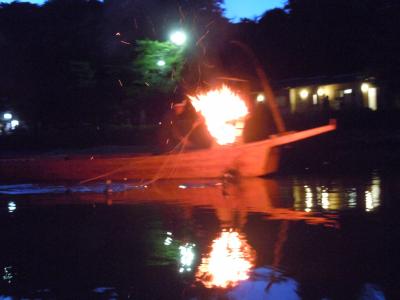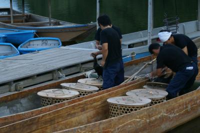 並んで停まっている遊覧船の前を、鵜飼の船が鵜を操りながら行き来します。- 旅行時期