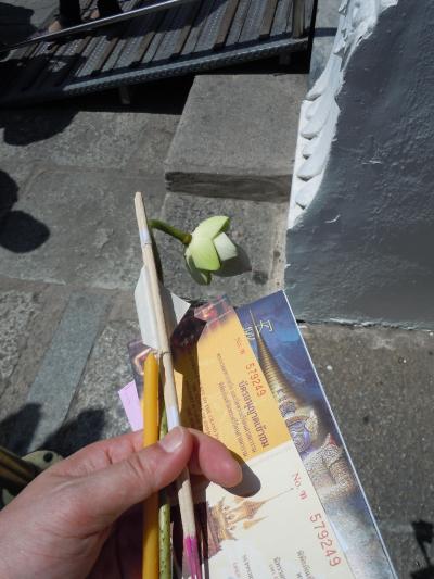 入場してすぐの場所で、ご希望ならお供え物を購入できます。ハスの花とろうそくと線香のセットです。
