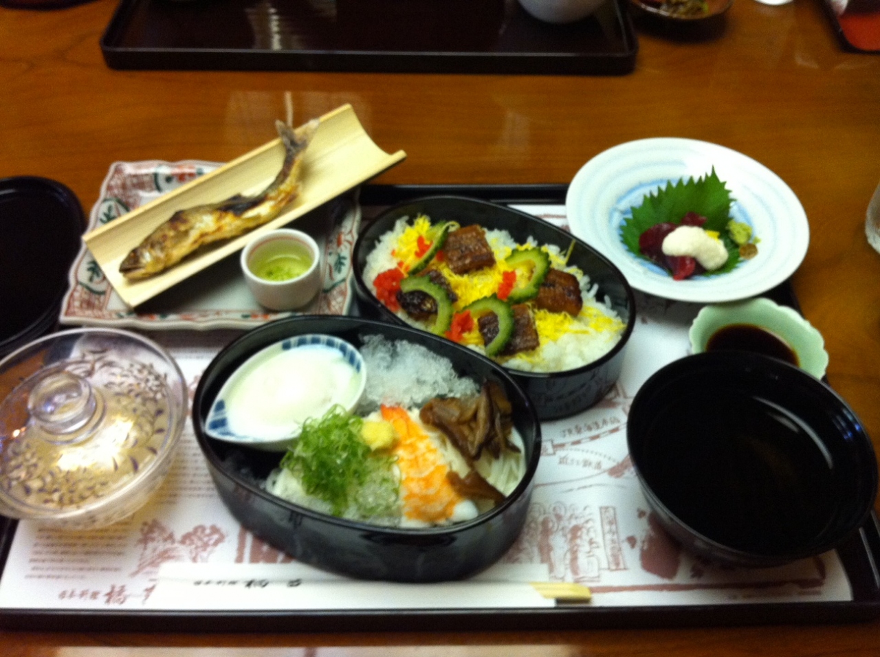 子供たちは「近江牛のステーキ重」、私はランチメニューの中から鮎や鰻が入ったお膳にしました。