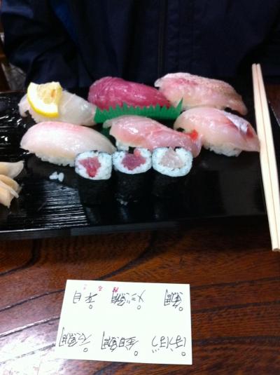 小雨降るあいにくの天気でしたが次々とお客さんが来ます。地魚のにぎりとあじのにぎりなどを注文しました。地魚の種類をメモにして渡されました。こういうの、子供が喜ぶんですよね。名前を確認しながらパクパク。