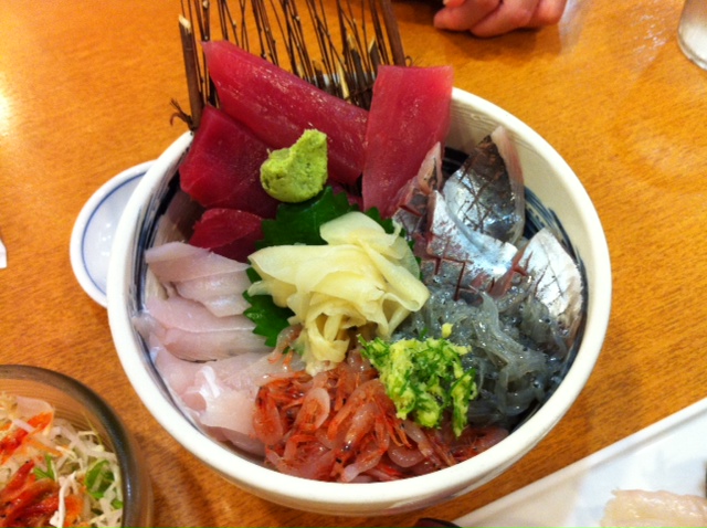 近海デラックスを注文。生シラス、生桜エビ、穴子など美味しくいただきました。この日は近海デラックスが何百円か割引になっていたので。。。