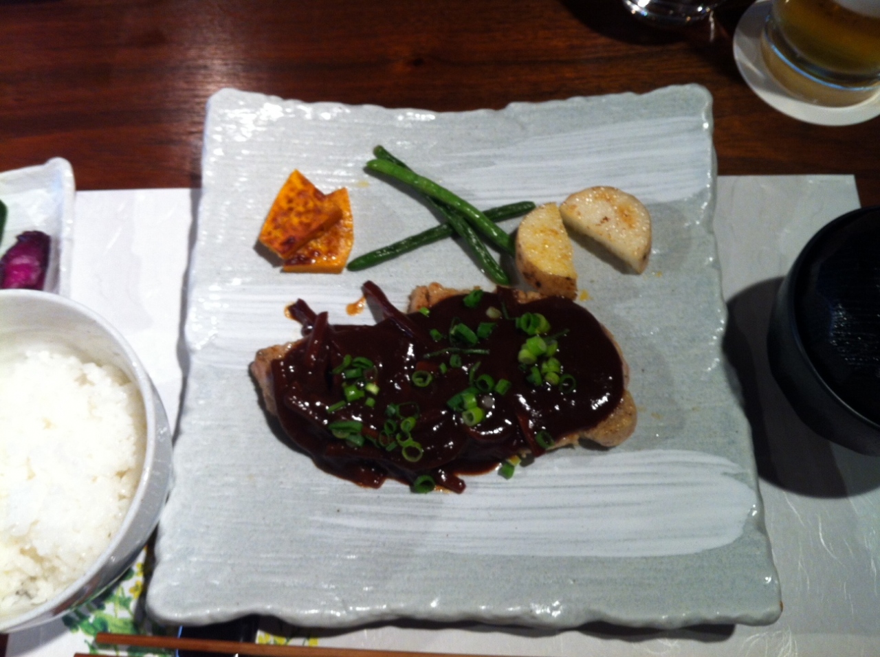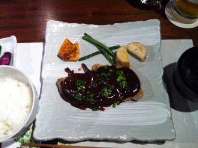 平日ランチタイムにお邪魔しました。当日のランチメニューは2種で、オムライスかポークソテーでした。私はポークソテーをチョイス。ソースは味噌とのこと、ん、失敗したかな? 名古屋に多い例の味噌系は苦手なんだよな。