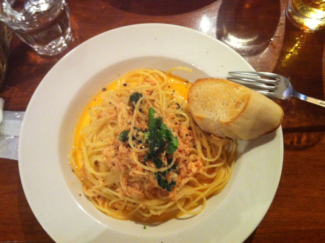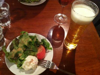 サーモンと菜の花のスパ、サラダ、ドリンク付きで1200円。ま、リーズナブルかな。