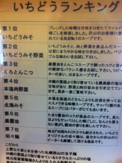 初入店でしたので、メニューと一緒に置かれた「いちどうランキング」に従い、1位の「いちどうみそ」を注文。他に「北海みそ」があり、こちらが札幌味噌ラーメン系なのでしょうか。
