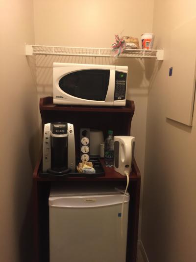 部屋には電子レンジ、冷蔵庫、コーヒーメーカーが備わってます。