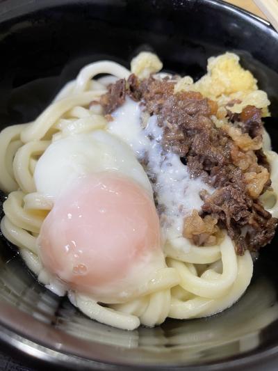 肉ぶっかけが売り切れで、オリーブ牛しぐれ煮うどんを注文しました。
