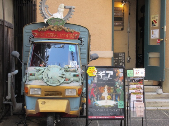 当初は大阪毎日新聞社京都支局ビルとして1928年に造られました。現在は2階はギャラリーで3階は劇場「ギア-GEAR-」になっています。ビル前のカッコいい三輪車が印象的です。