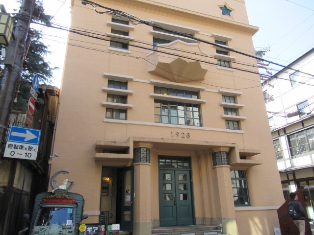 三条名店街のアーケードを抜け左側に色使いの良いレトロの建物が見えてきます。これが「1928ビル」です。