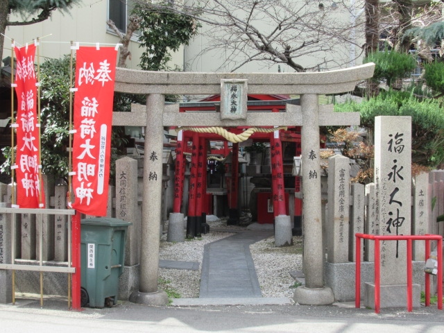 新世界稲荷神社は通天閣から北へ約100m、南北に通る春日山にありました。稲荷大明神と書かれた幟が立てられ、鳥居の額には福永大神と書かれ付近では目立っています。