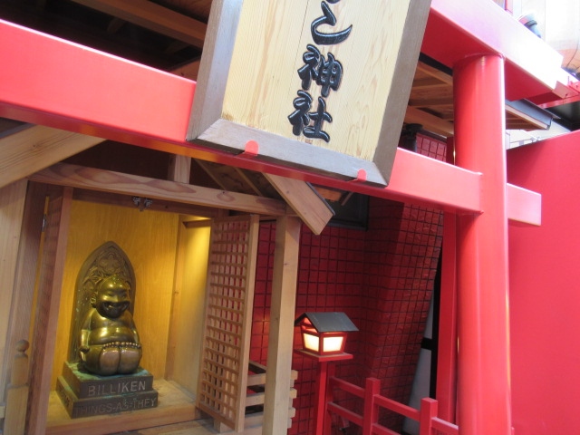 ビリケンはアメリカ生まれの福の神で、足の裏を笑顔で触れば願いが叶うと言われています。ウロチョロしていると至るところの店に飾られ商売繁盛を願っています。
