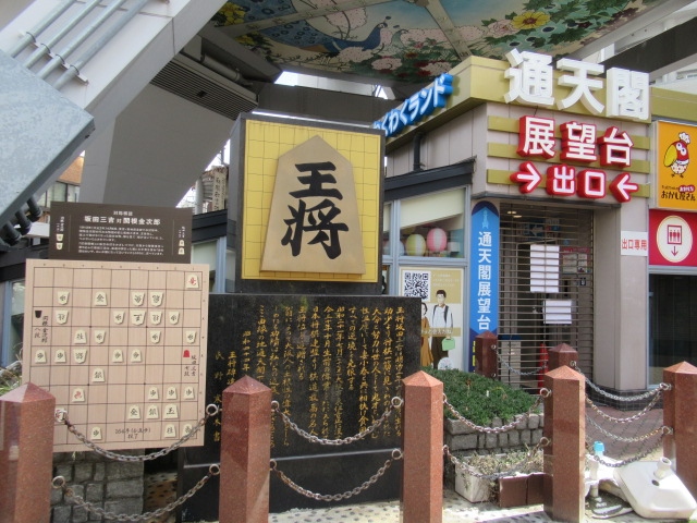 通天閣は食事処や見どころ多いところで通天閣の真下に「王将碑」が建っています。大阪堺市生まれ、大正時代の将棋名人「坂田三吉」の偉業をたたえ建てられました。